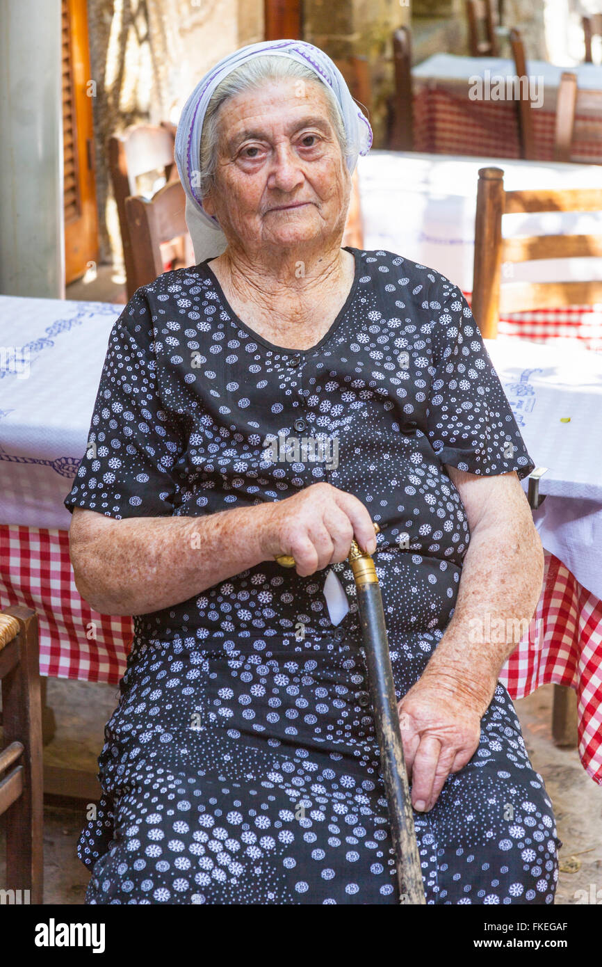 Anciana sentada, sosteniendo un bastón, en la aldea de la Mesta, Chios
