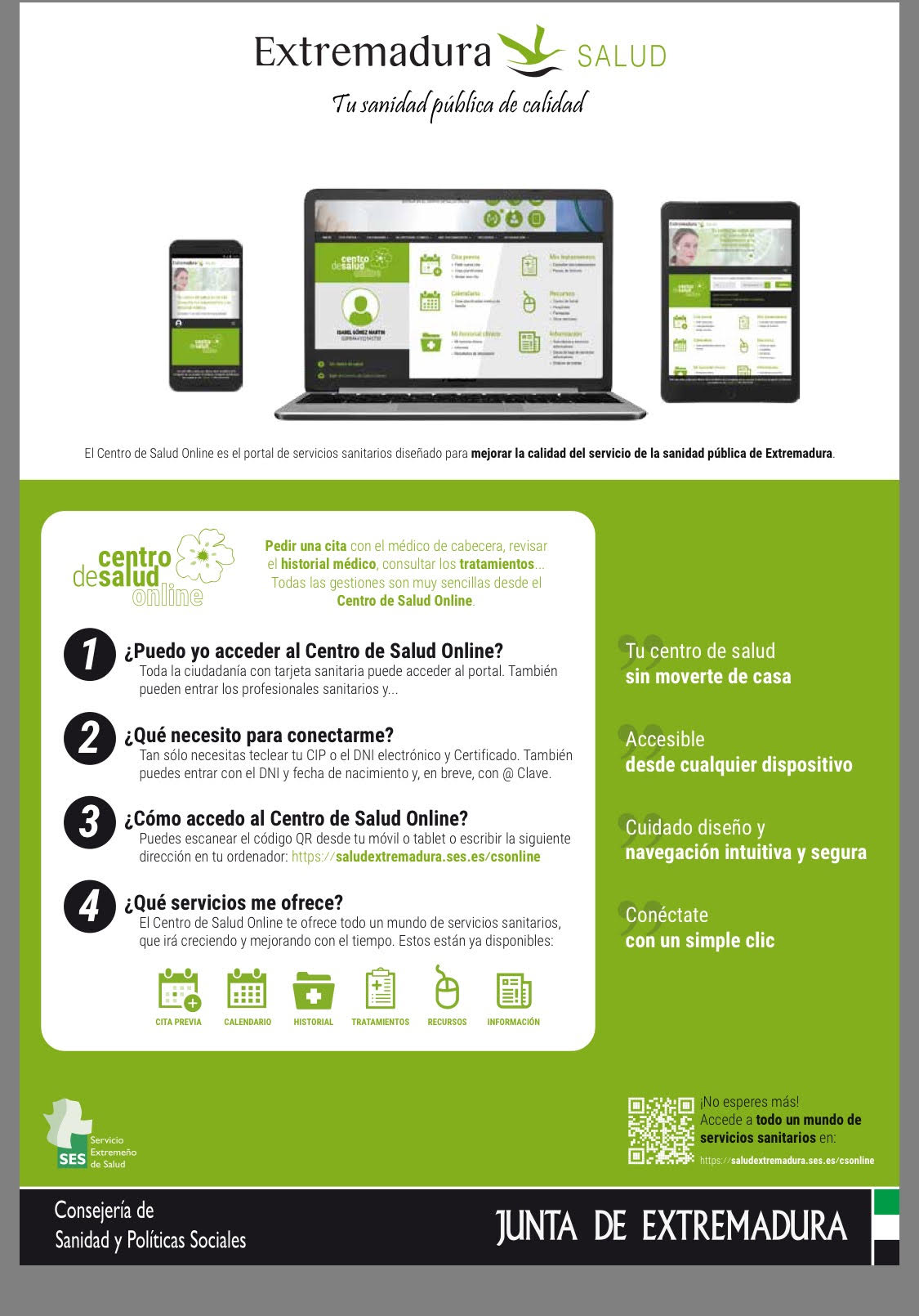 El Centro de Salud Online es el portal de servicios sanitarios diseñado para mejorar la calidad del servicio de la sanidad pública de Extremadura