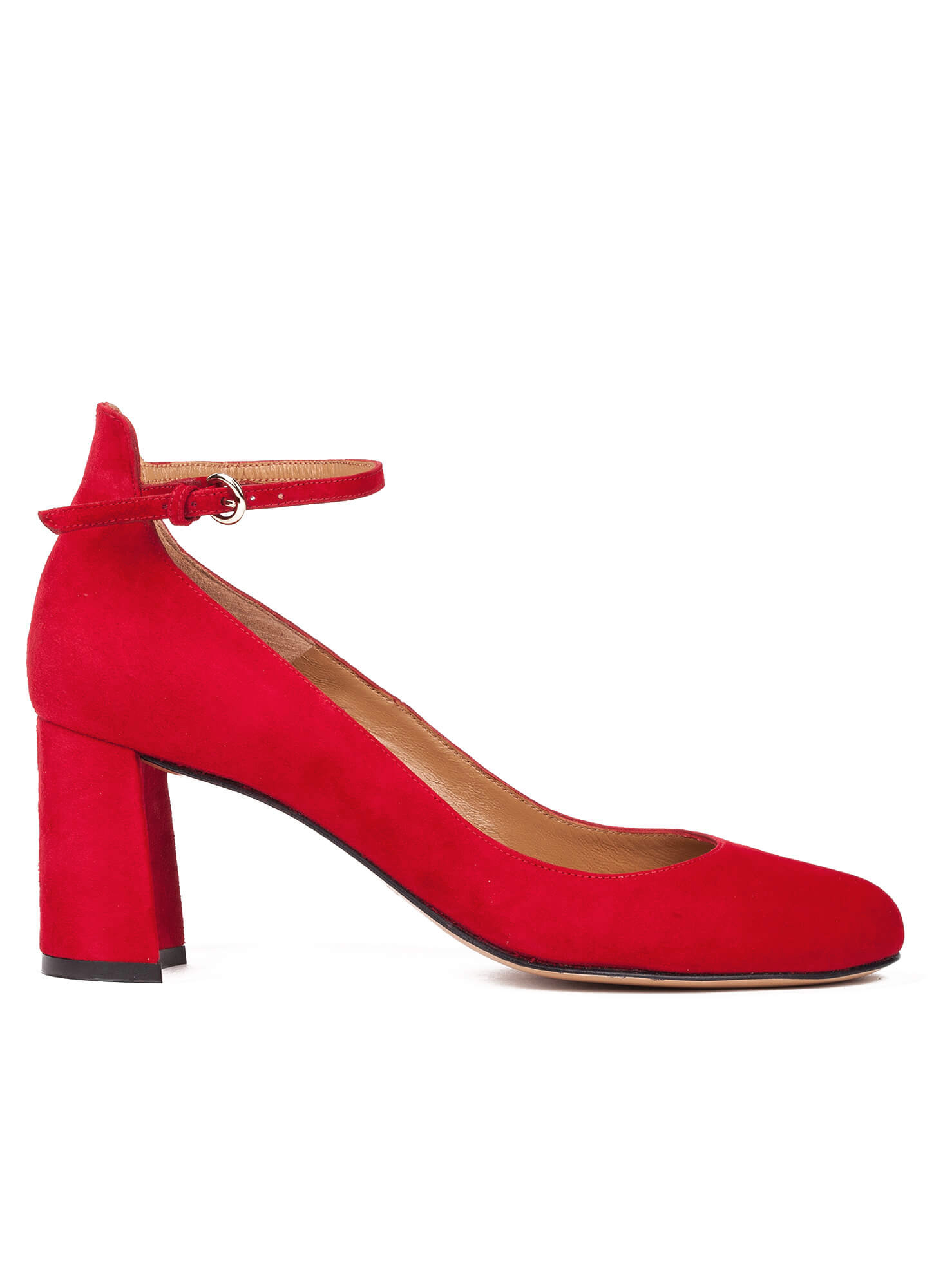 Zapatos de medio tacón en ante rojo tienda de zapatos Pura López . PURA LOPEZ