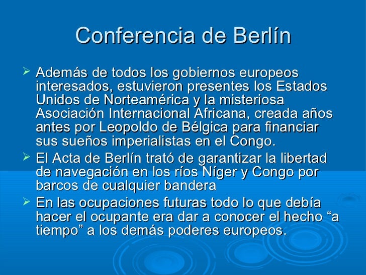 Conferencia de Berlín (1884-1885). Reunión política de 14 países, en su mayoría potencias coloniales europeas, celebrada en Berlín, entre noviembre de 1884 y febrero de 1885, para reglamentar la colonización de África, y en especial del Congo belga. La colonización de África y del Congo Desde los años 70, por diversas razones, varios.