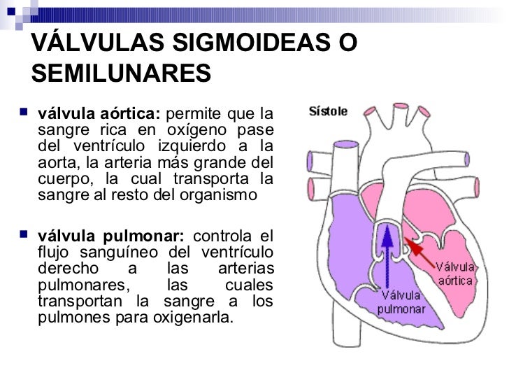 Las Válvulas semilunares, compuestas por la válvula aórtica que controla la salida de la sangre del corazón hacia la arteria aorta y la válvula pulmonar que regula la salida de sangre del ventrículo derecho hacia la arteria pulmonar para que se oxigene la sangre a través de los pulmones.