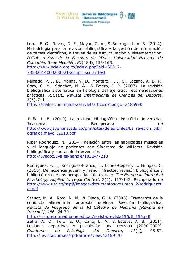 Ejemplo de revisión bibliográfica. Publicado el 22 de diciembre de 2016 por Marta Carrasquilla.Fecha de actualización: 8 de marzo de 2017. En los anteriores artículos de esta categoría, te hemos mostrado cómo se realiza y estructura una revisión bibliográfica paso a paso.. Es por eso que a continuación te queremos mostrar un ejemplo de una revisión bibliográfica al completo, donde.
