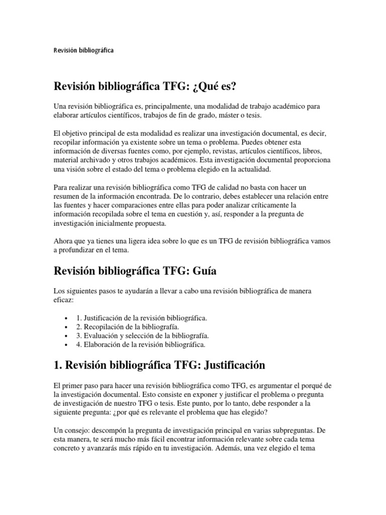 Revisión Bibliográfica TFG: Guía Completa 2023. Matheus Dezembro 13, 2023 Uncategorized. Una revisión bibliográfica es esencial en un Trabajo de Fin de Grado (TFG). Este artículo proporcionará una guía completa sobre cómo realizar una revisión bibliográfica en el marco de un TFG. Exploraremos los pasos, la estructura y la importancia.