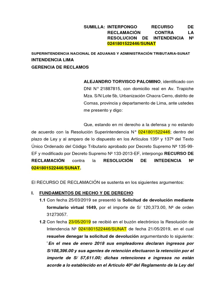 SOLICITUD de DEVOLUCION Devolucion Denegada Alejandro Torvisco Palomino PDF Salario