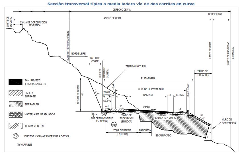 2.1. Generalidades. La sección transversal de un camino es su intersección con un plano vertical perpendicular a la proyección horizontal del eje. Se denomina zona de camino al área total de la facilidad vial entre líneas frontales de propiedad, afectado a la vía pública.