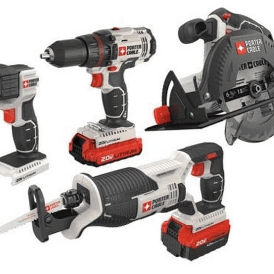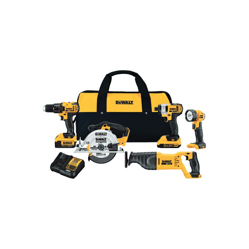 Este kit combinado inalámbrico de 5 herramientas cuenta con herramientas eléctricas DEWALT que incluyen un taladro/destornillador de 20 V MAX*, destornillador de impacto, sierra circular, sierra recíproca, dos baterías de iones de litio de 20 V MAX* 2ah, cargador y una bolsa de herramientas.