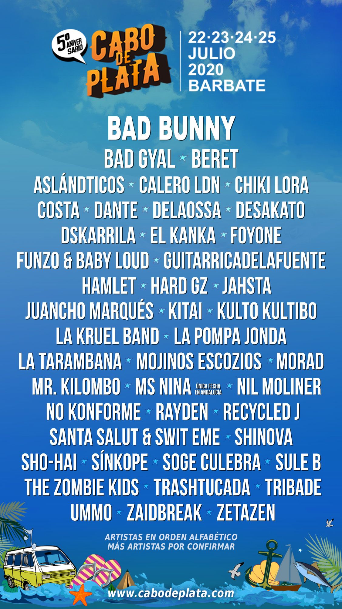 Past concerts See all. Wednesday 20 July 2022 - Saturday 23 July 2022. Outdoor. Festival Cabo de Plata 2022 Nengo Flow, Beret, Bad Gyal, Mala Rodríguez, Macaco, Morad, Ayax y Prok, and SFDK. Playa de la Hierbabuena de Barbate , Cadiz, Spain. I was there. Thursday 05 July 2018 - Saturday 07 July 2018. Outdoor.