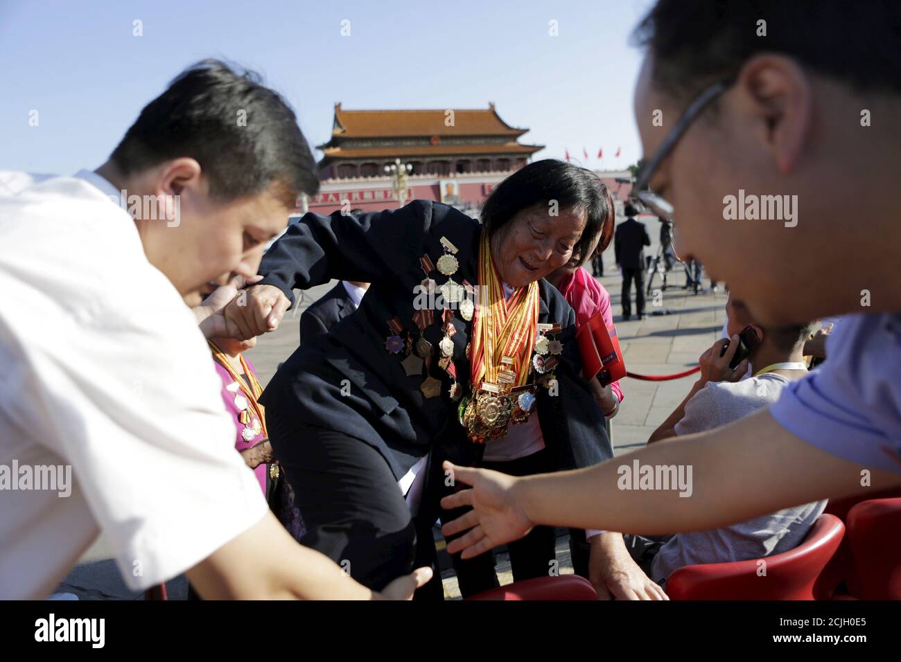 Shen Jilan con insignias y medallas es ayudado a su asiento, antes del desfile militar para